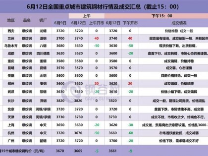 【成交追踪】6月12全国重点城市建筑钢材行情及成交汇总(15:00)