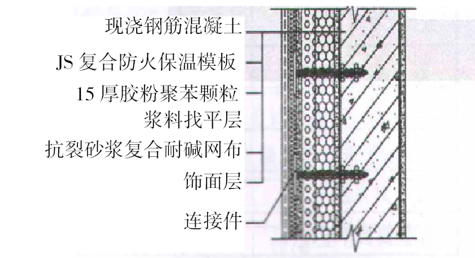 其工艺原理为:保温层、加强肋、保温过渡层、内外侧连接加强层组成的复合保温板(图1)。保温过渡层可以缓解保温模板因环境温度变化产生的应变,避免抹面层空鼓、开裂等。现场用保温一体化模板作为永久性外模板,与普通模板安装方式类似,通过连接件(锚钉)将保温一体化模板与混凝土牢固连接在一起而形成完整的保温体系。外侧做水泥砂浆抹面层和饰面层,抹面层仅需在薄弱位置使用加强网进行加固处理(图1)。