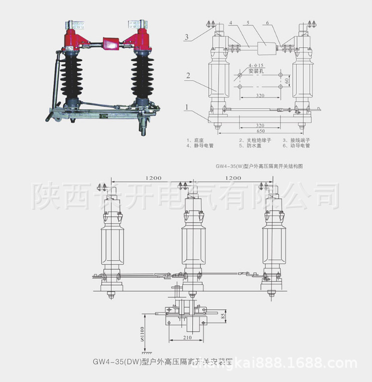 杆连接起来。各单极都由基座、支柱绝缘子、出线座及触头等部分组成,两支柱绝缘瓷瓶相互平行地安装在